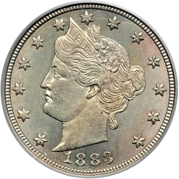 1883 Liberty Nickel. Without "CENTS". Our grade is MS60+ with lovely toning (PCGS # 3841) .