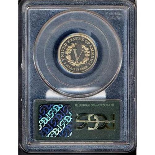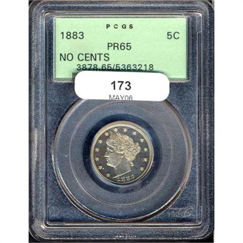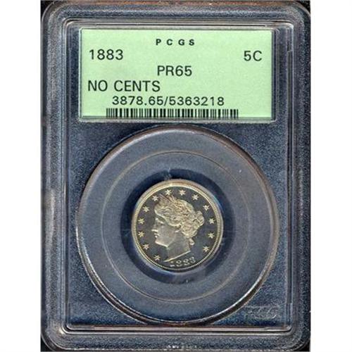 <b>1883 Liberty Nickel. Without "CENTS". PCGS graded Proof 65.</b> Although uniformly frosted on the devices, the fields are, by contrast, glittery with mirror freshness, the deeper glow from the Proof surface giving a deeper shade than the devices on both sides. The overall appearance is one of full brilliance and beauty in a Proof No CENTS Liberty nickel. A one-year design, only 5,219 Proofs were issued <b>(PCGS # 3878)</b>