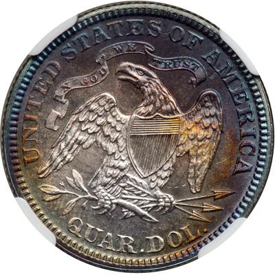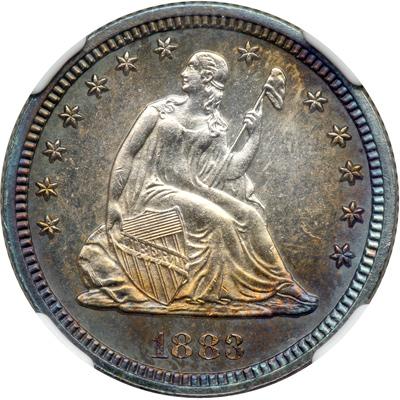 1883 Liberty Seated Quarter Dollar. Only 14,400 pieces struck. Artificial toning. In our opinion, knowing the consignor, this coin was stored in an old Raymond folder and it toned naturally over many years, so pay heed and give it the bid it deserves.