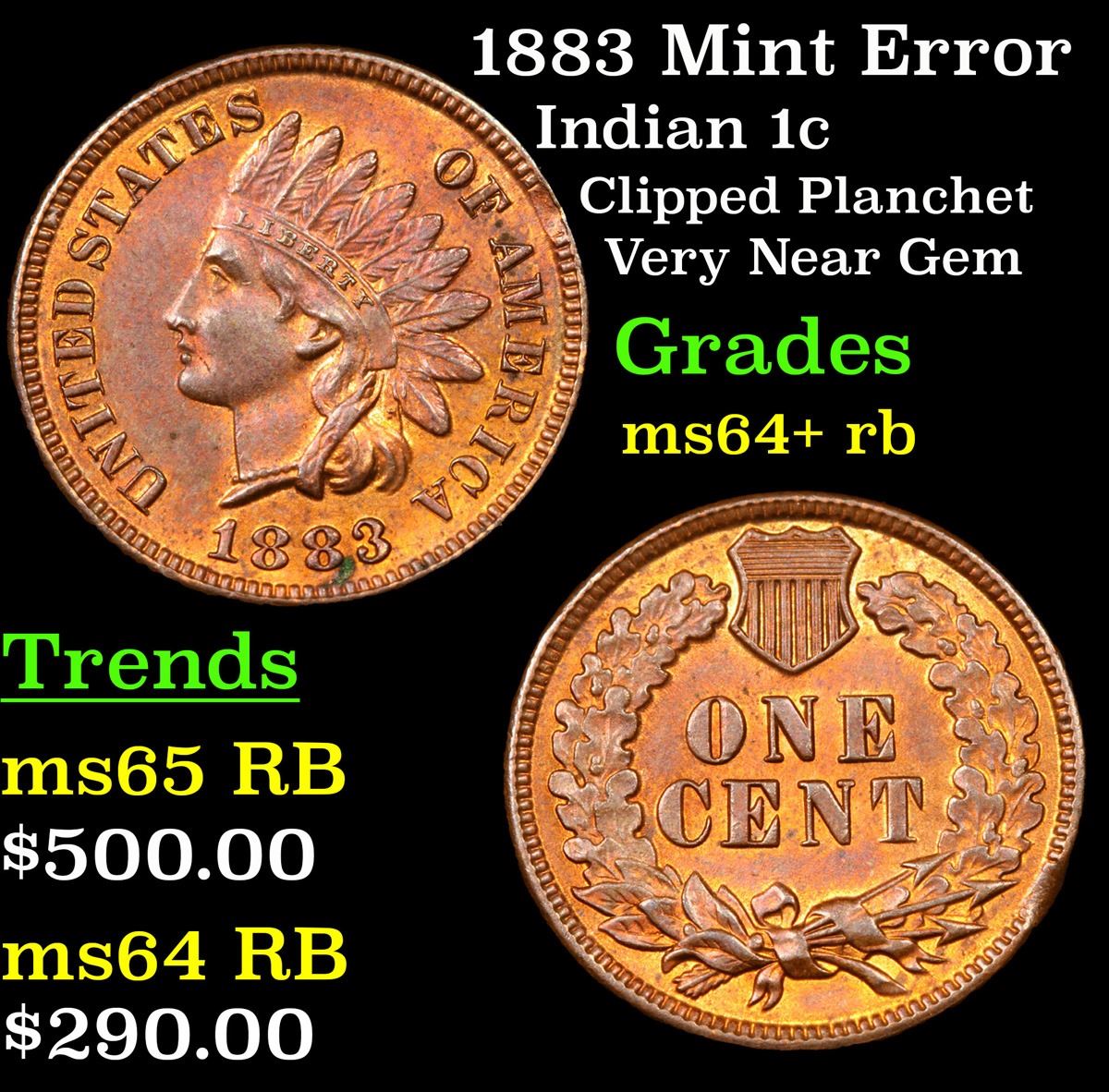1883 Mint Error Indian Cent 1c Grades Choice+ Unc RB. Clipped Planchet Very Near Gem