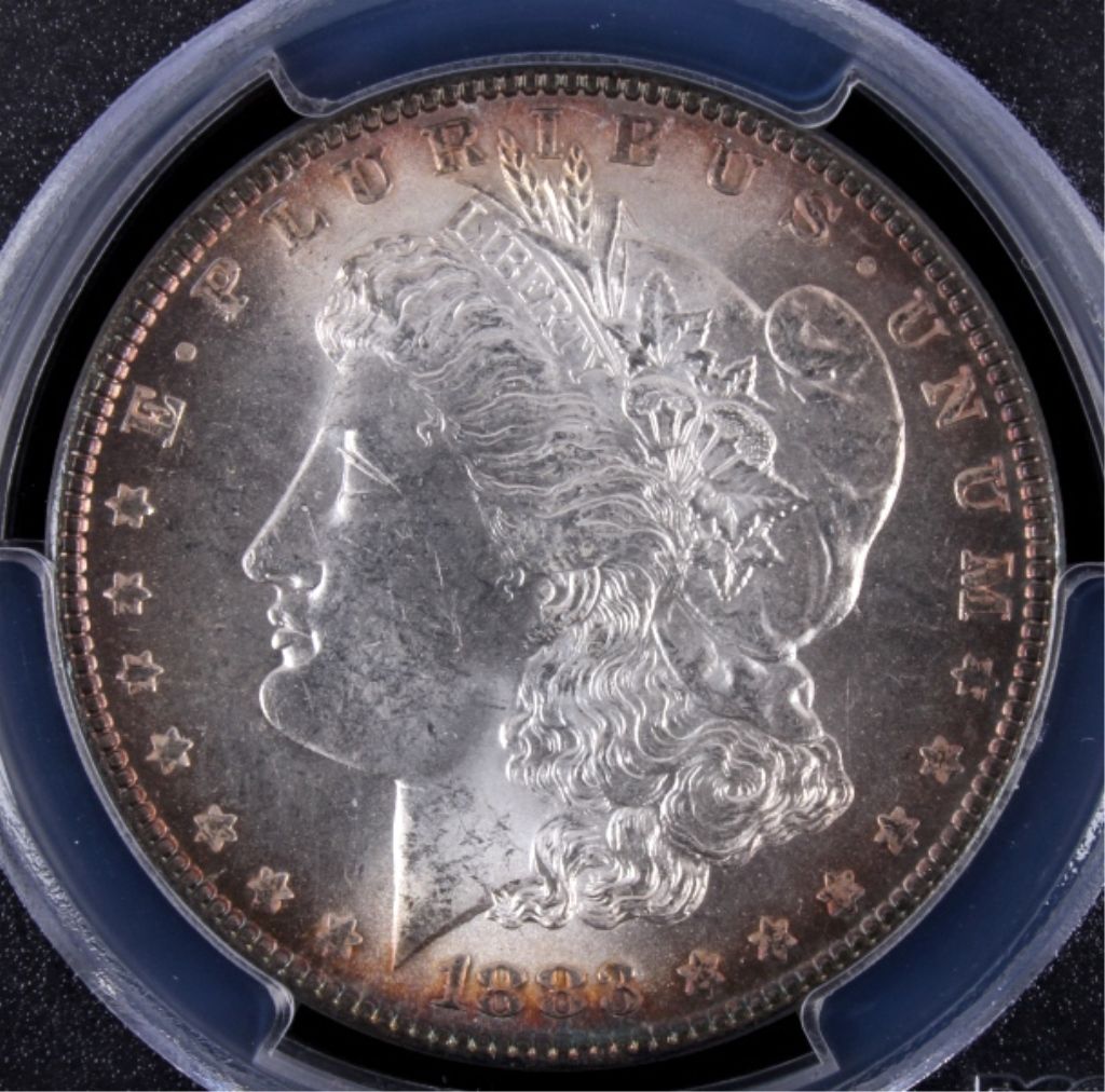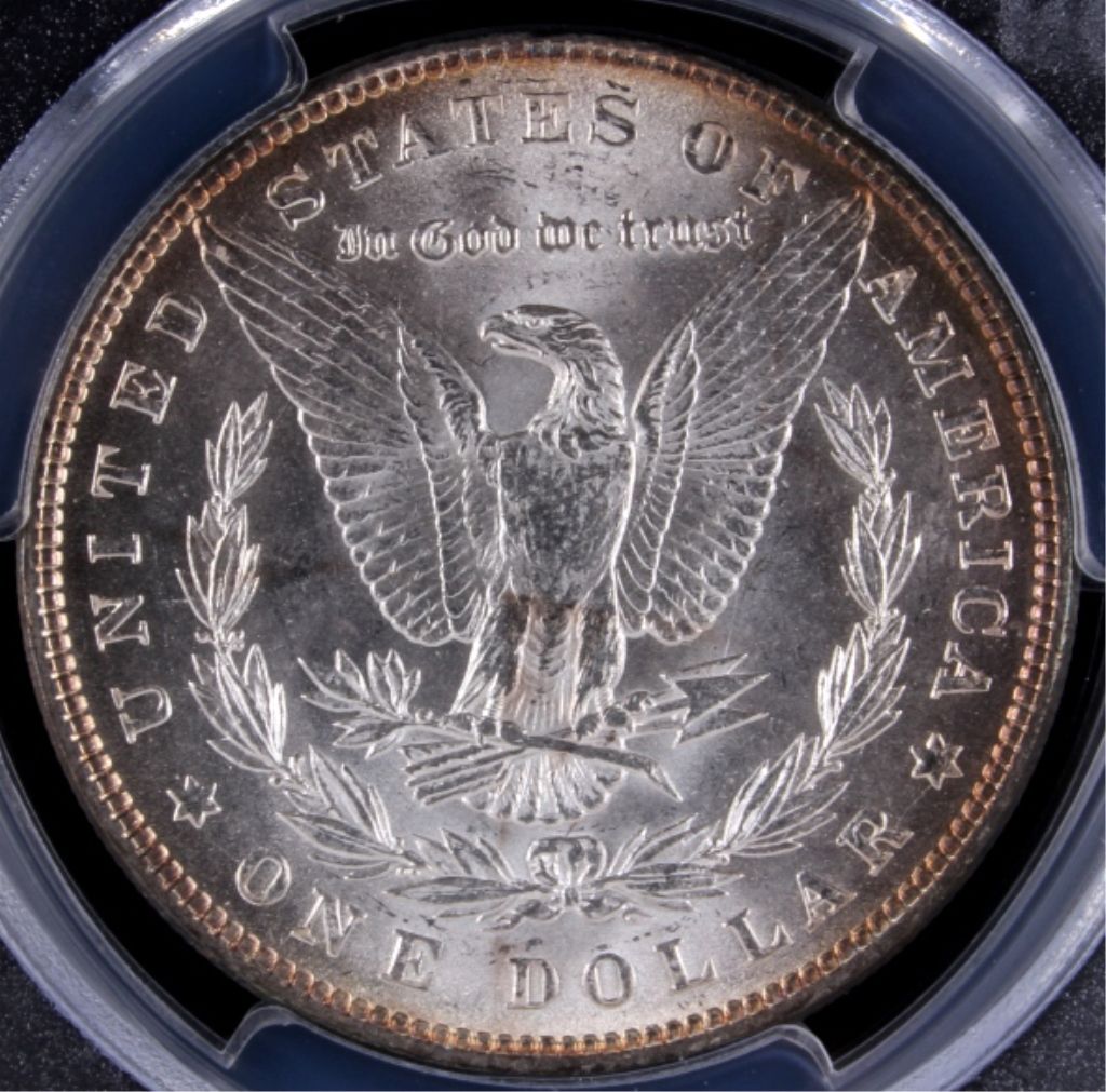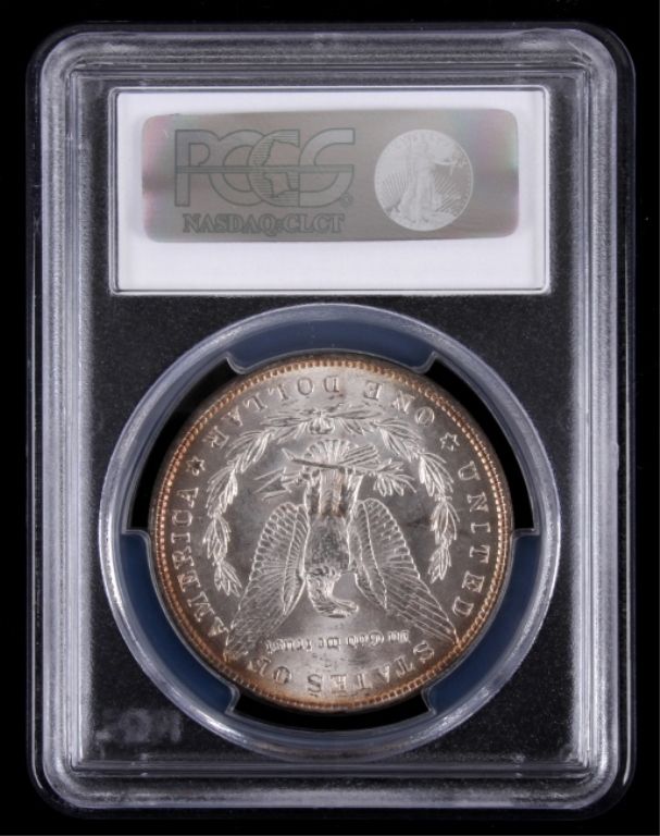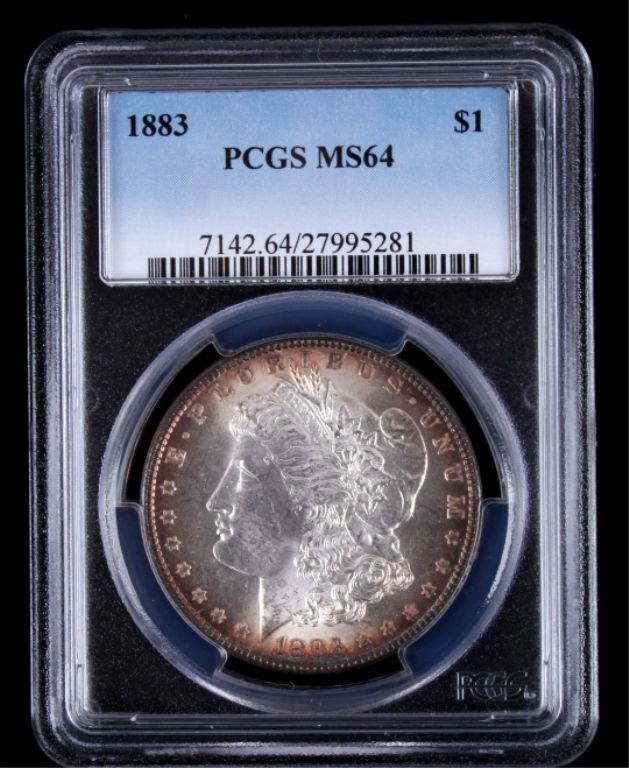 This coins was struck at the Philadelphia Mint in 1883. The coin was graded and sealed by Professional Coin Grading Service. Graded at Mint State 64 which means this is an uncirculated coin. This has a golden rainbowtone around both the front and back edge.