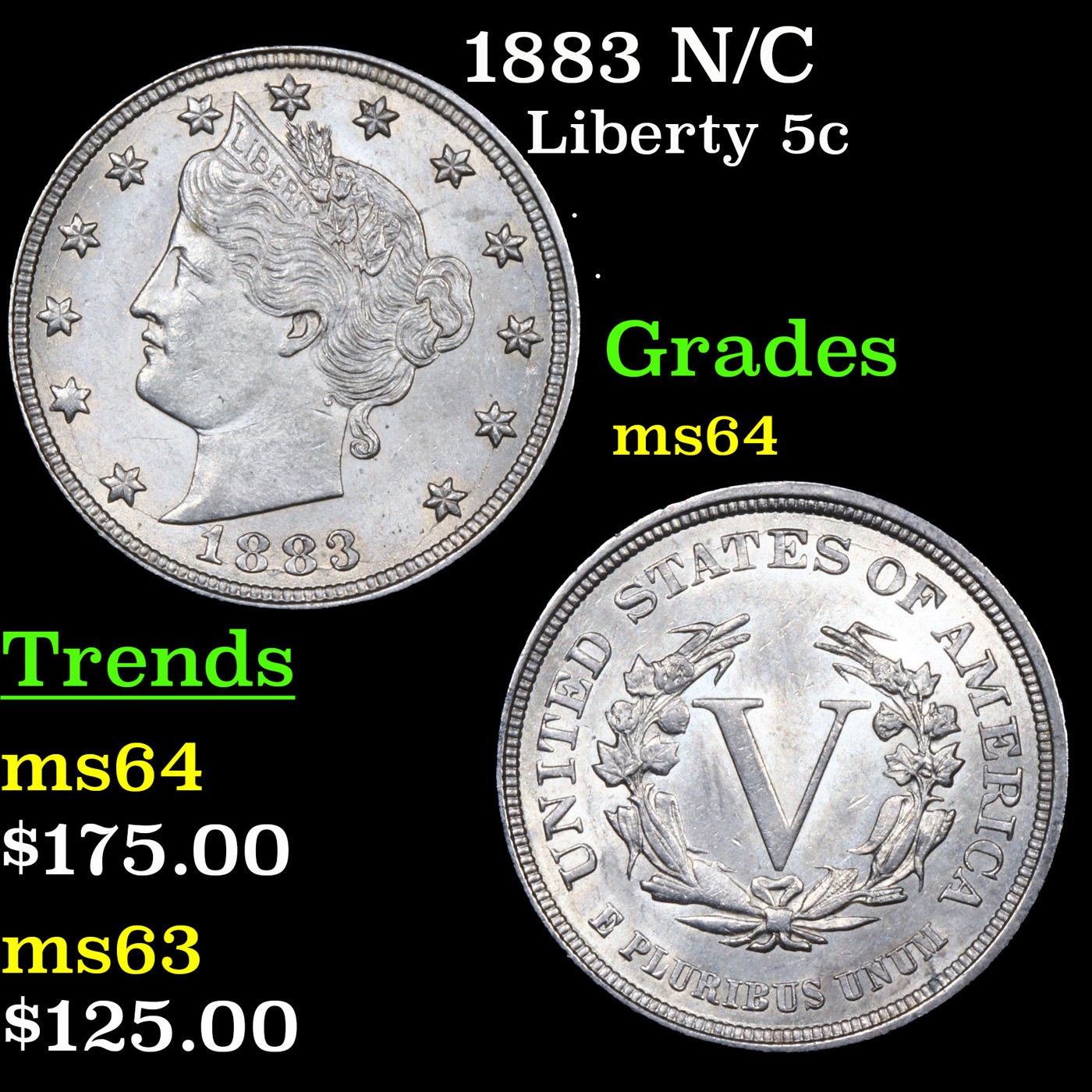 1883 N/C Liberty Nickel 5c Grades Choice Unc.