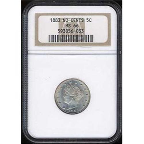 Full blazing glory with the surfaces nickel-bright and even displaying a hint of a blue sheen so popular with collectors and sometimes found on high-end specimens. A one-year Type, the mint chose not to include a denomination other than the large Roman V. Later in the year it saw the error of its ways and the mint added CENTS below the wreath to indicate to a non-judicious public that this was, truly, a five-cent denomination and not something else.