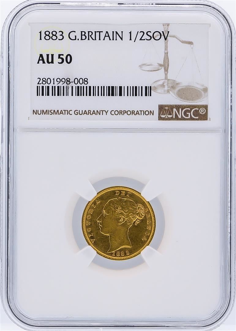 One 1883 NGC AU50 Great Britain 1/2 Sovereign Gold Coin. NGC Certified.