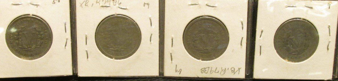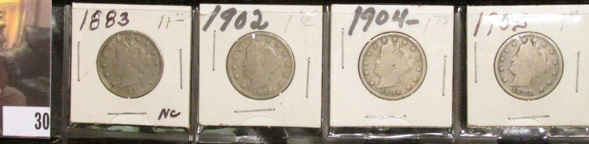1883 No Cents, 1902, 1904, & 05 U.S. Liberty "V" Nickels, Good to VF.