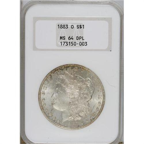 <B>1883-O $1 MS64 Deep Mirror Prooflike NGC.</B></I> NGC Census: (276/60). PCGS Population (427/100). Numismedia Wsl. Price for NGC/PCGS coin in MS64: $260. (#97147)<BR><BR><b>Shipping:</b> Coins & Currency (<a target="_blank" href="http://www.heritageauctions.com/common/shipping.php">view shipping information</a>)