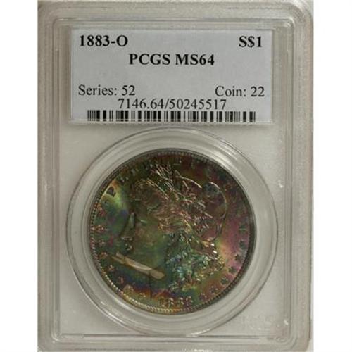 <B>1883-O $1 MS64 PCGS.</B></I> Delightful emerald, cobalt, crimson, and gold toning hide the satiny obverse luster with the brilliant reverse framed by a ring of light gold.<BR><BR><B>Coin Engraver:</B> George T. Morgan<BR><BR><b>Shipping:</b> Coins & Currency (<a target="_blank" href="http://www.heritageauctions.com/common/shipping.php">view shipping information</a>)