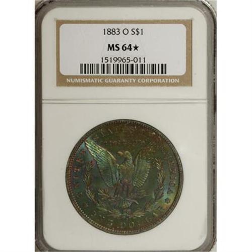 <B>1883-O $1 MS64 <img border='0' src='http://www.heritagecoins.com/images/star.gif' width=10 height=10> NGC.</B></I> Exciting blue-green, gold, and rose-red shades dominate the reverse. The obverse has an almond-gold margin accompanied by a brilliant field and portrait.<BR><BR><B>Coin Engraver:</B> George T. Morgan<BR><BR><b>Shipping:</b> Coins & Currency (<a target="_blank" href="http://www.heritageauctions.com/common/shipping.php">view shipping information</a>)