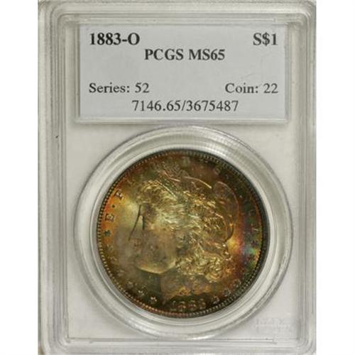 <B>1883-O $1 MS65 PCGS.</B></I> PCGS Population (5586/555). NGC Census: (7179/750). Mintage: 8,725,000. Numismedia Wsl. Price for NGC/PCGS coin in MS65: $122. (#7146)<BR><BR><b>Shipping:</b> Coins & Currency (<a target="_blank" href="http://www.heritageauctions.com/common/shipping.php">view shipping information</a>)