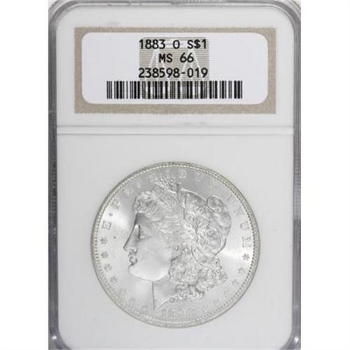 <B>1883-O $1 MS66 NGC.</B></I> . NGC Census: (760/24). PCGS Population (565/27). Mintage: 8,725,000. Numismedia Wsl. Price for NGC/PCGS coin in MS66: $360. (#7146)<BR><BR><B>Coin Engraver:</B> George T. Morgan<BR><BR><b>Shipping:</b> Coins & Currency (<a target="_blank" href="http://www.heritageauctions.com/common/shipping.php">view shipping information</a>)