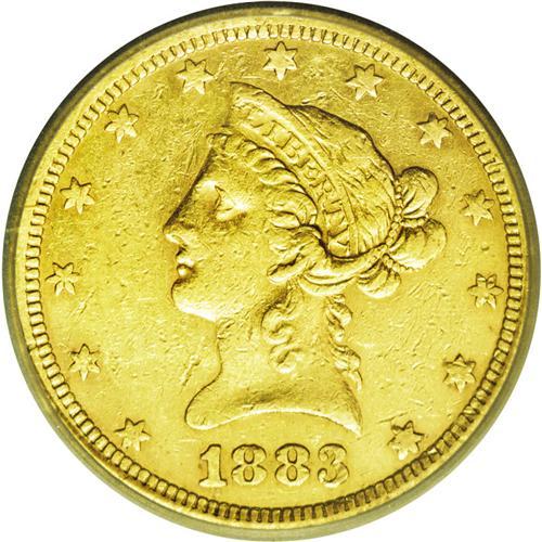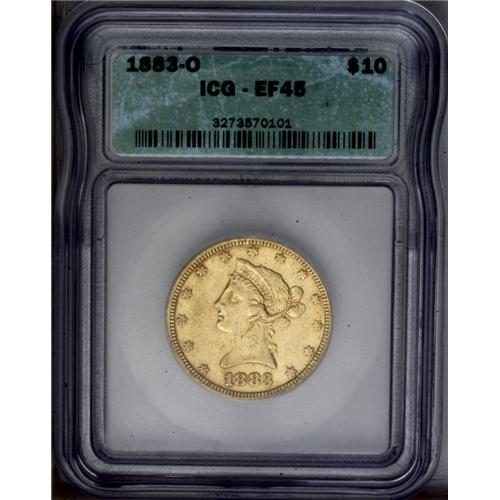 1883-O $10 XF45 ICG. At 800 pieces, this issue has the