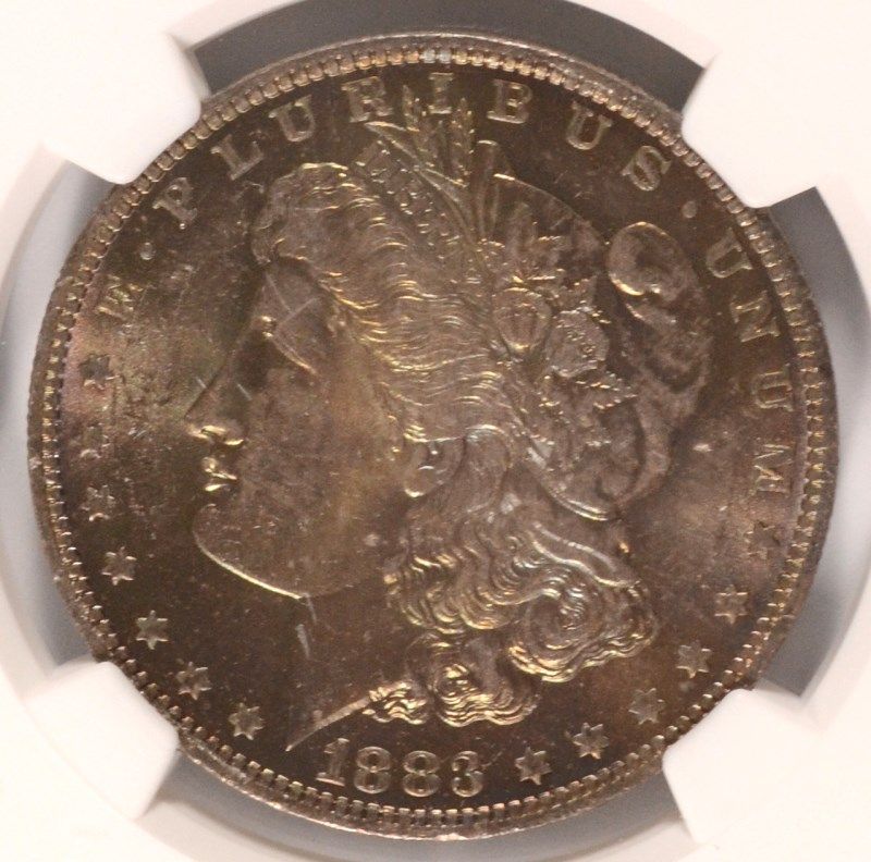 1883-O MORGAN SILVER DOLLAR, NGC MS-65, BEAUTIFUL COLORS