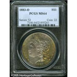 <B>1883-O<img border='0' src='http://www.heritagecoins.com/images/star.gif' width=10 height=10>$1 MS64 PCGS.</B></I> Well struck with uneven, multicolored, and speckled toning over both sides. An interesting planchet streak (as struck) extends along Liberty's jawline. Flashy full luster increases the eye appeal of this moderately marked near-Gem. Lot:10128