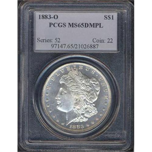 <b>1883-O Morgan Dollar. PCGS graded MS65 DMPL.</b> The blazing silver-white surfaces are smooth from rim to rim with no carbon to report. Sharply struck and fully lustrous frosted devices, both sides possess eye appeal to spare. A blunt impression is sometimes left after the recoil of the dies that struck this year's O-mint coinage; just the same, we can report that this specimen, unlike the others, is outstanding in its detail and sharpness <b>(PCGS # 7147)</b>