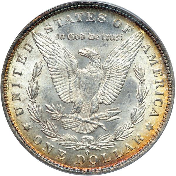 1883-O Morgan Dollar. PCGS graded MS-65. Beautiful rainbow toning covers the obverse (PCGS # 7146) .