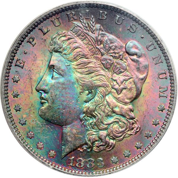 1883-O Morgan Dollar. PCGS graded MS-64. Lovely green and deep rose toning is vividly displayed on both sides. It is colors like these which attract bids from near and far (PCGS # 7146) .