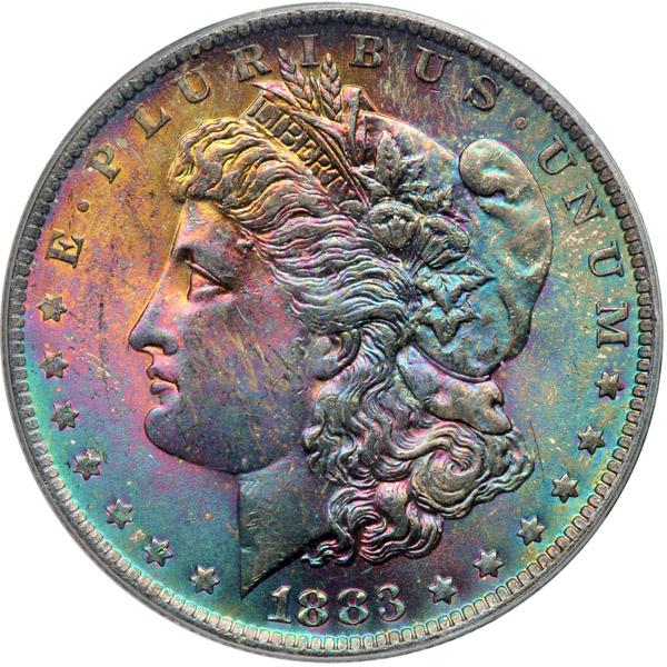1883-O Morgan Dollar. PCGS graded MS-65. A magnificent gem! The obverse exhibits mesmerizing colors including intense green, magenta and golden hues. The reverse shows a touch of toning around the borders (PCGS # 7146) .