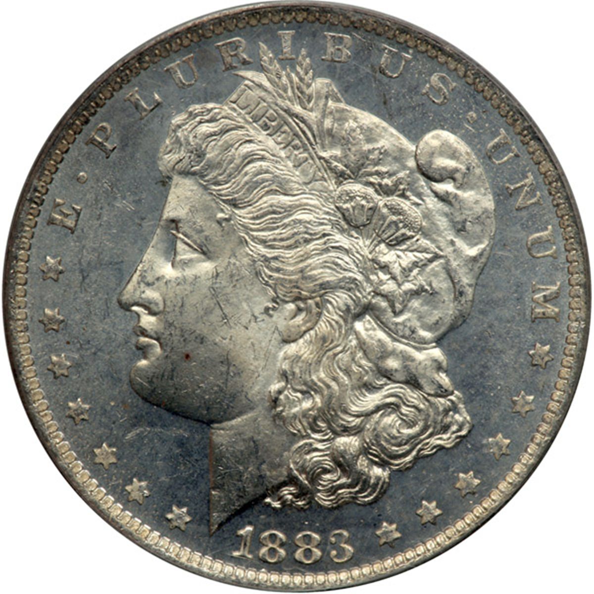 1883-O Morgan Dollar. PCGS graded MS-64 Deep Mirror Prooflike. Untoned and in an OGH. Prooflikes, it is said, are the first strikes from newly installed dies since the mint polishes the face of dies before installing them in the press for strikiing. Prooflike collecting has a large following (PCGS # 97147) .