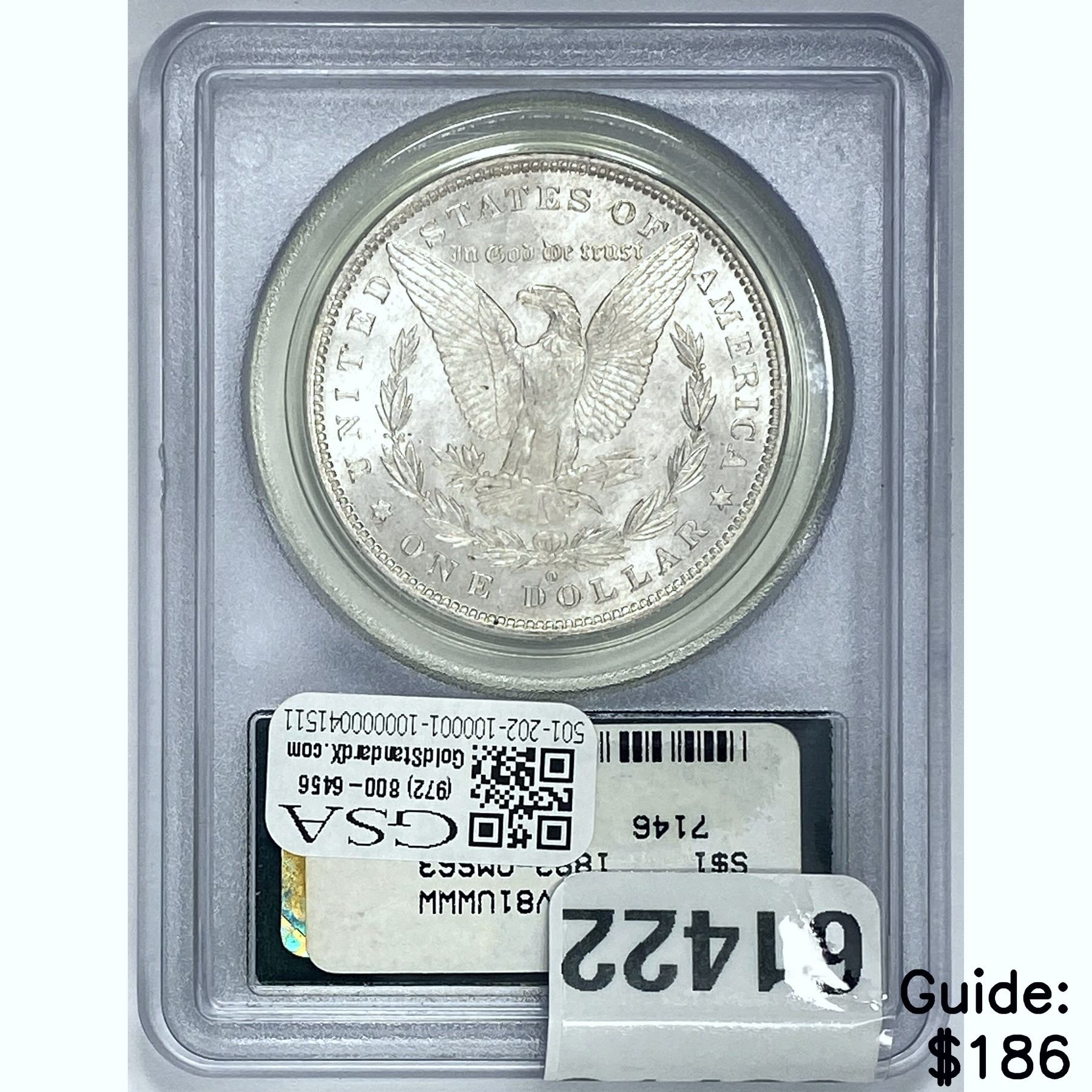 l. All non-certified coins and currency are guaranteed genuine, but are not guaranteed as to grade, since grading is a matter of opinion, an art and not a science, and therefore the description rendered by GSA or any third-party grading service may not agree with the opinion of others (including trained experts), and the same expert may not grade the same item with the same grade at two different times. GSA may, but is not obligated to, express an opinion as to non-certified numismatic items, in GSA’s opinion, or by its employees’ experience and the current interpretation of the American Numismatic Association’s standards as of the date the catalog was prepared. There is no guarantee or warranty expressed or implied that the grading opinions utilized by GSA, if any, will meet the standards of any grading service at any time in the future.
