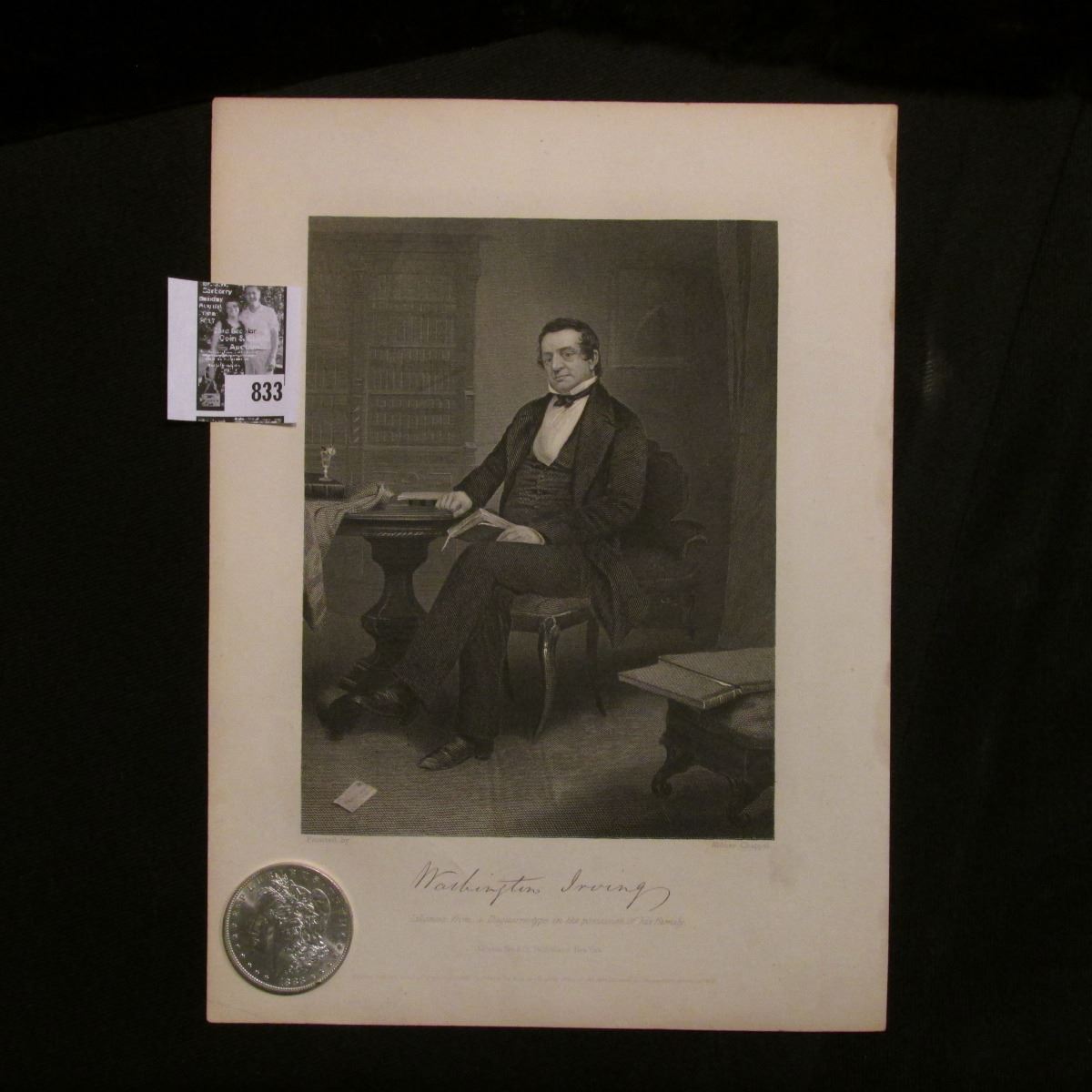 1883 O Morgan Silver Dollar Brilliant Uncirculated; and a black & white print of Washington Irving, with a copy of his original signature.