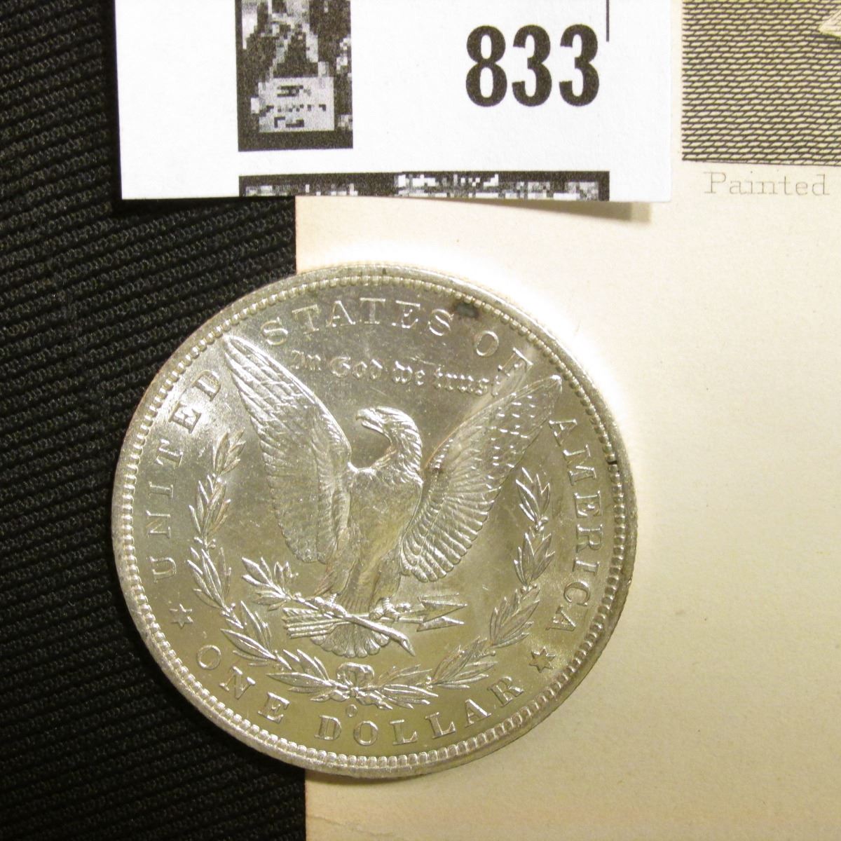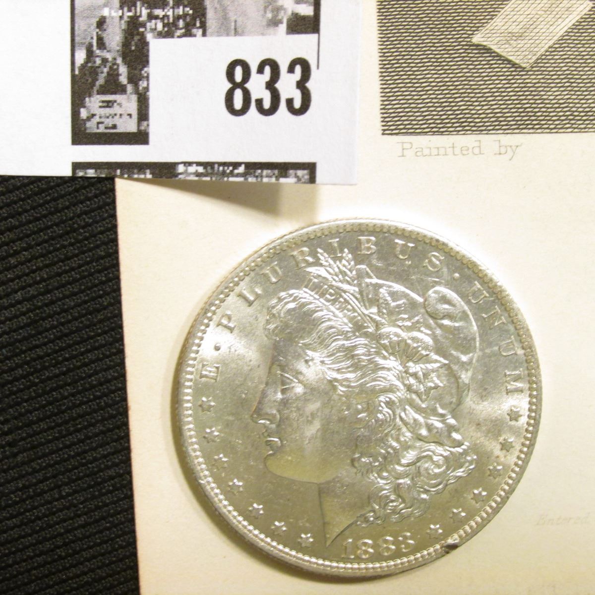 1883 O Morgan Silver Dollar Brilliant Uncirculated; and a black & white print of Washington Irving,