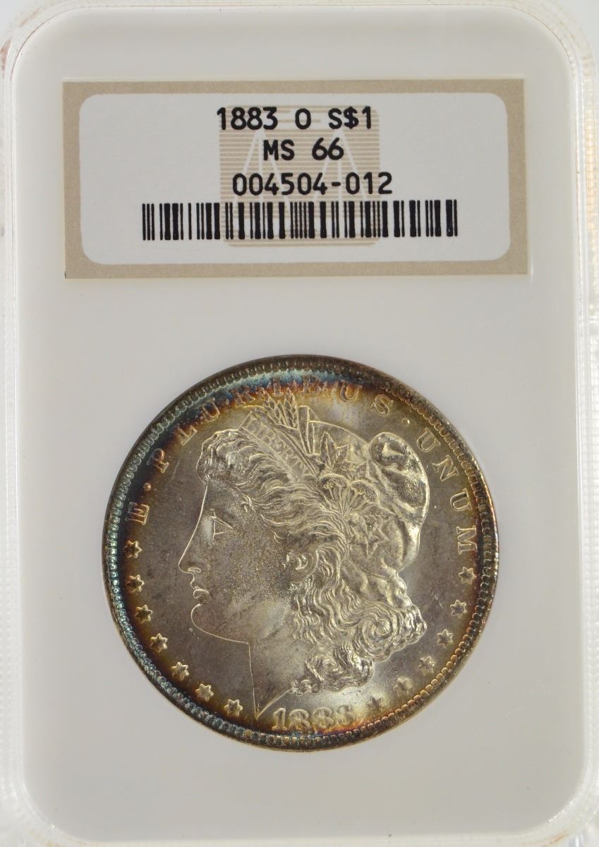 1883 "O" NGC MS66 United State Morgan Silver Dollar with nice deep blue toning around the outer collar of both the obverse and reverse.