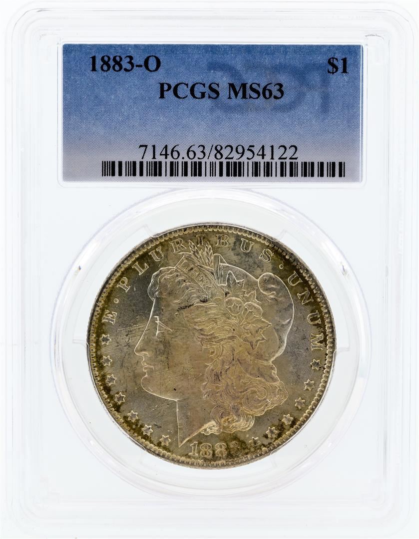 One 1883-O PCGS MS63 Morgan Silver Dollar.