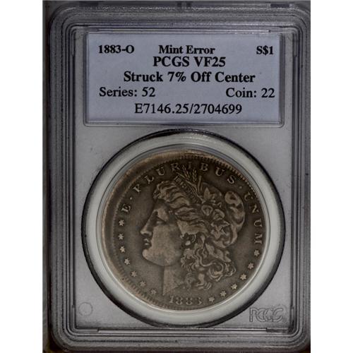 <B>1883-O<img border='0' src='http://www.heritagecoins.com/images/star.gif' width=10 height=10>$1 Error> Morgan Dollar--Struck 7% Off Center--VF25 PCGS.</B></I> Struck off center toward 4 o'clock. All lettering is complete, although the eagle's right (facing) wingtip is partly off the coin. A nicely detailed piece with medium lavender-brown patina and a few moderate marks above the leaves of the olive branch. <BR><BR><B>Important notice:</B> Heritage usually auctions material at the rate of 200-250 lots per hour. On some occasions eBay Live bid software or the Internet may not be able to keep up with the pace of the auction. We recommend placing a realistic absentee bid now as insurance to avoid disappointment. Occasionally the auctioneer may eliminate or reject an eBay Live bid, and the auctioneer may also reopen a lot after the close of the eBay live bidding (usually because we missed an audience bid), and may reject your bid even if it shows you as the winning bidder. By bidding via eBay Live, you agree that Heritage may award the lot to another bidder at its sole discretion under the circumstances described above or any other reasonable circumstances. Since eBay bids are not shown to us until we open the lot on the floor, we treat those bids just like floor bids. In most cases the floor responds before the eBay bid is presented to us, due to Internet lag time, so for consistency we have made it a policy that floor bids are always considered first over tie eBay live bids. Also please note that all Heritage lots purchased through eBay Live carry a 20% Buyer's Premium. Please make sure you read the Terms and Conditions before you bid. This lot is being auctioned in conjunction with a live floor auction by Heritage Galleries & Auctioneers. All final auction and invoice information will be supplied by Heritage Galleries & Auctioneers, and all other information should be considered preliminary. Lot:5381 <BR><BR><B>Winning Notification and Billing:</B> After the FINAL session in this auction is complete, Heritage will send e-mail and snail mail invoices. This process normally takes several days. All final auction and invoice information will be supplied by Heritage Galleries & Auctioneers, and all other information should be considered preliminary. <BR><BR>This auction will be conducted on a live auction floor and over the Internet through eBay Live. If you choose to place an absentee bid, please take a moment to <font color='#0000ff'><u><a href='http://pages.ebay.com/liveauctions/help/before/laabsentee.html'>learn how eBay Live absentee bidding works</a></u></font><font color='#000000'>