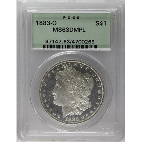 <B>1883-O<img border='0' src='http://www.heritagecoins.com/images/star.gif' width=10 height=10>$1> MS63 Deep Mirror Prooflike PCGS.</B></I> Light and subtle champagne toning covers intense and flashy mirrors. Sharply struck for the date with minimal abrasions in the fields.<BR><I>From The Chicago-Ark Collection.</B></I>