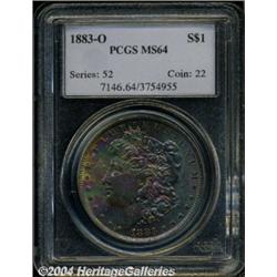 <B>1883-O<S$1> MS64 PCGS.</B></I> A colorful mixture of jade-green, deep red, and gold toning blankets the obverse in a variegated fashion. Typically struck for this popular O-mint date.<BR><I>From the JFS Collection.</B></I> <BR><BR><B>Important notice:</B> Heritage usually auctions material at the rate of 200-250 lots per hour. On some occasions eBay Live bid software or the Internet may not be able to keep up with the pace of the auction. We recommend placing a realistic absentee bid now as insurance to avoid disappointment. Occasionally the auctioneer may eliminate or reject an eBay Live bid, and the auctioneer may also reopen a lot after the close of the eBay live bidding (usually because we missed an audience bid), and may reject your bid even if it shows you as the winning bidder. By bidding via eBay Live, you agree that Heritage may award the lot to another bidder at its sole discretion under the circumstances described above or any other reasonable circumstances. Since eBay bids are not shown to us until we open the lot on the floor, we treat those bids just like floor bids. In most cases the floor responds before the eBay bid is presented to us, due to Internet lag time, so for consistency we have made it a policy that floor bids are always considered first over tie eBay live bids. Also please note that all Heritage lots purchased through eBay Live carry a 20% Buyer's Premium. Please make sure you read the Terms and Conditions before you bid. </span></font></tr></table></td></tr></table>