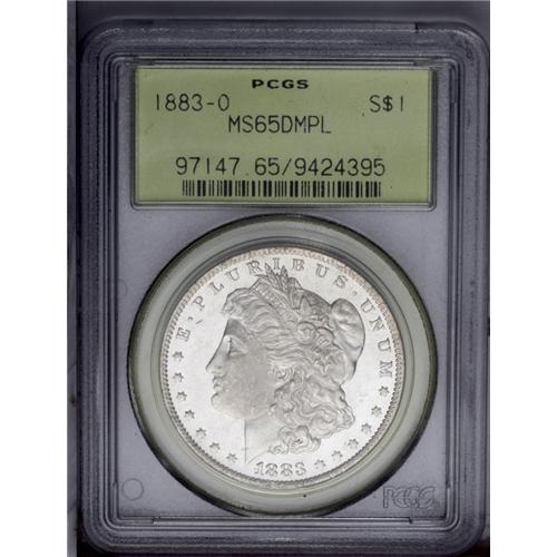 <B>1883-O<img border='0' src='http://www.heritagecoins.com/images/star.gif' width=10 height=10>$1> MS65 Deep Mirror Prooflike PCGS.</B></I> A carefully preserved Gem with pleasing reflectivity and modest white-on-black contrast. Struck from a lightly rusted obverse die. Housed in a green label holder. Population: 85 in 65, 11 finer (2/06). <BR><BR><B>Important notice:</B> Heritage usually auctions material at the rate of 200-250 lots per hour. On some occasions eBay Live bid software or the Internet may not be able to keep up with the pace of the auction. We recommend placing a realistic absentee bid now as insurance to avoid disappointment. Occasionally the auctioneer may eliminate or reject an eBay Live bid, and the auctioneer may also reopen a lot after the close of the eBay live bidding (usually because we missed an audience bid), and may reject your bid even if it shows you as the winning bidder. By bidding via eBay Live, you agree that Heritage may award the lot to another bidder at its sole discretion under the circumstances described above or any other reasonable circumstances. Since eBay bids are not shown to us until we open the lot on the floor, we treat those bids just like floor bids. In most cases the floor responds before the eBay bid is presented to us, due to Internet lag time, so for consistency we have made it a policy that floor bids are always considered first over tie eBay live bids. Also please note that all Heritage lots purchased through eBay Live carry a 20% Buyer's Premium. Please make sure you read the Terms and Conditions before you bid. This lot is being auctioned in conjunction with a live floor auction by Heritage Galleries & Auctioneers. All final auction and invoice information will be supplied by Heritage Galleries & Auctioneers, and all other information should be considered preliminary. Lot:3378 <BR><BR><B>Winning Notification and Billing:</B> After the FINAL session in this auction is complete, Heritage will send e-mail and snail mail invoices. This process normally takes several days. All final auction and invoice information will be supplied by Heritage Galleries & Auctioneers, and all other information should be considered preliminary. <BR><BR>This auction will be conducted on a live auction floor and over the Internet through eBay Live. If you choose to place an absentee bid, please take a moment to <font color='#0000ff'><u><a href='http://pages.ebay.com/liveauctions/help/before/laabsentee.html'>learn how eBay Live absentee bidding works</a></u></font><font color='#000000'>
