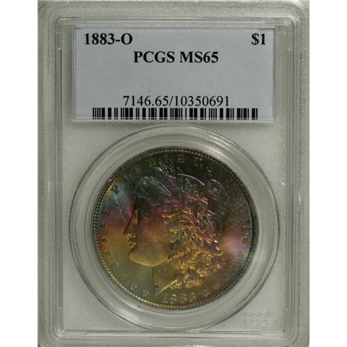 <B>1883-O S$1 MS65 PCGS.</B></I> The reverse of this highly lustrous dollar is mostly brilliant with traces of gold patina at the periphery. The obverse has dramatic rainbow toning, with green and blue at the top that turn to violet and magenta. Orange and lemon-yellow covers most of the lower half.<BR><BR><b>Shipping:</b> Coins & Currency (<a target="_blank" href="http://www.heritageauctions.com/common/shipping.php">view shipping information</a>)