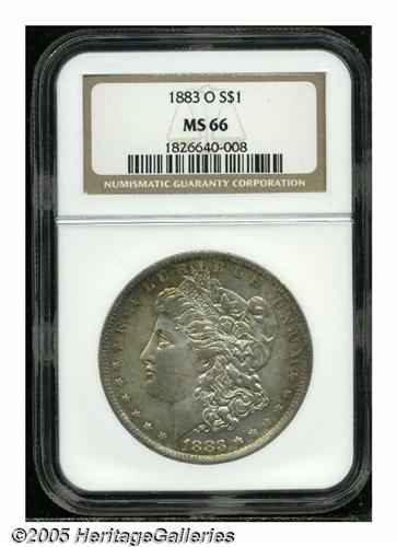 <B>1883-O<S$1> MS66 NGC.</B></I> Lovely original golden-brown and sea-green toning adorns the obverse and reverse peripheries, and the satiny surfaces are virtually mark-free. Other than typical softness above Liberty's ear, the striking details are bold throughout.