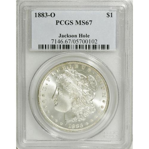 <B>1883-O S$1 MS67 PCGS.</B></I> Ex: Jackson Hole. A handsome Superb Gem that boasts booming luster and gorgeous preservation. Nearly brilliant, but a trace of tan color visits both sides. The New Orleans Mint dollars are characterized by generally weak strikes, often lacking detail above Liberty's ear and on the eagle's breast. This example is an exception to that rule, and possesses exceptional detail in both of those locations, as well as everywhere else. Perhaps Dave Bowers was considering this coin when he said: "Cherrypicking is definitely recommended, this making all the difference between <I>your</B></I> high-quality collection and the ordinary quality of most others." Population: 28 in 67, 0 finer (2/07).<BR><I>From The Jackson Hole Collection.</B></I><BR><BR><b>Shipping:</b> Coins & Currency (<a target="_blank" href="http://www.heritageauctions.com/common/shipping.php">view shipping information</a>)