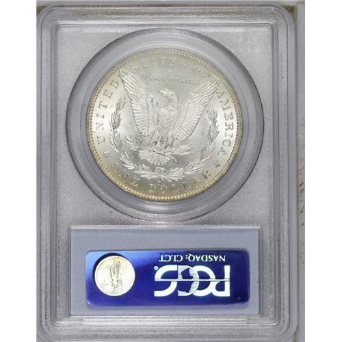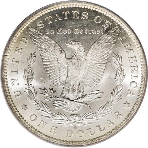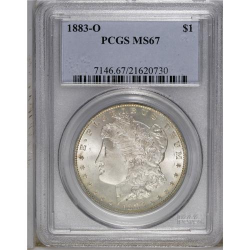 <B>1883-O<img border='0' src='http://www.heritagecoins.com/images/star.gif' width=10 height=10>$1> MS67 PCGS.</B></I> This is a truly impressive New Orleans Mint product, displaying substantial cartwheel luster and pleasing border toning on both sides. The striking details are outstanding, and nearly full. Careful preservation has prevented all but the most minimal of surface blemishes. Population: 28 in 67, 0 finer at either service (8/06).
