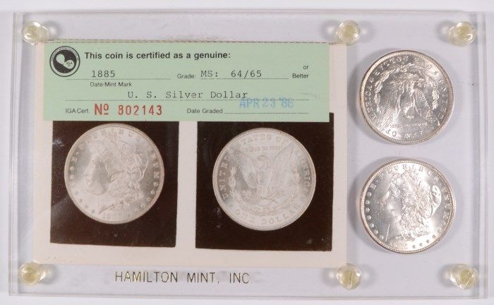 1883-O and 1885 Morgan Dollars in Hamilton Mint Plastic Holder, Graded MS64/65