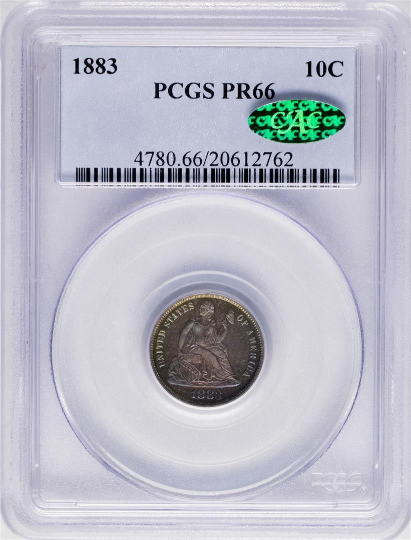 One 1883 Proof Seated Liberty Dime Coin Arrows PCGS PR66 CAC Amazing Toning. PCGS Graded.
