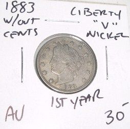 1883 *RARE-1ST YEAR* LIBERTY "V" NICKEL *RARE AU HIGH GRADE* RED BOOK VALUE IS $30.00+!! COIN CAME OUT OF SAFE!! ***Coin, Currency & All Items Listed in this auction - Grades, Conditions and Values are not Safe Deposit Coins LLC Responsibilty. Grades, Condition and Values are determined by Consigner(s) & Buyers ONLY