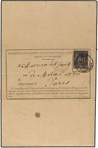 1883 Registered Advice of Receipt envelope addressed to the PHILIPPINES bearing French Type Sage 10 cts. Yvert 89, tied by PARIS RUE D´AMSTERDAM datestamp with boxed registered and SINGAPORE transit applied in red. Very scarce destination to Manila.