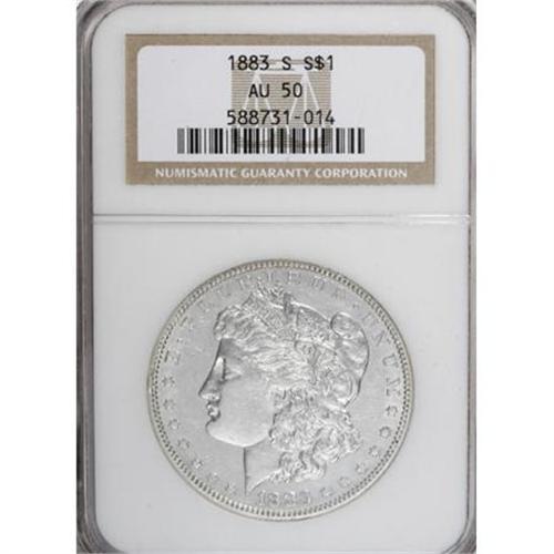 <B>1883-S $1 AU50 NGC.</B></I> . NGC Census: (333/2667). PCGS Population (233/3140). Mintage: 6,250,000. Numismedia Wsl. Price for NGC/PCGS coin in AU50: $115. (#7148)<BR><BR><B>Coin Engraver:</B> George T. Morgan<BR><BR><b>Shipping:</b> Coins & Currency (<a target="_blank" href="http://www.heritageauctions.com/common/shipping.php">view shipping information</a>)
