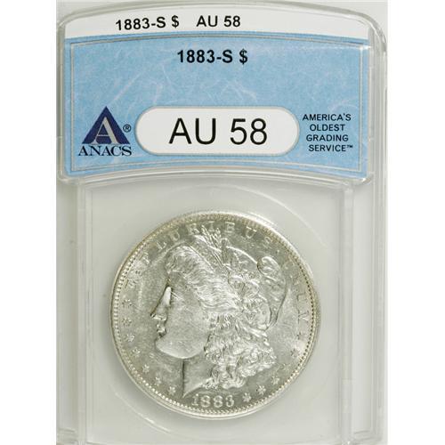 <B>1883-S $1 AU58 ANACS.</B></I> NGC Census: (384/1328). PCGS Population (284/2085). Mintage: 6,250,000. Numismedia Wsl. Price: $233. (#7148)<BR><BR><b>Shipping:</b> Coins & Currency (<a target="_blank" href="http://www.heritageauctions.com/common/shipping.php">view shipping information</a>)
