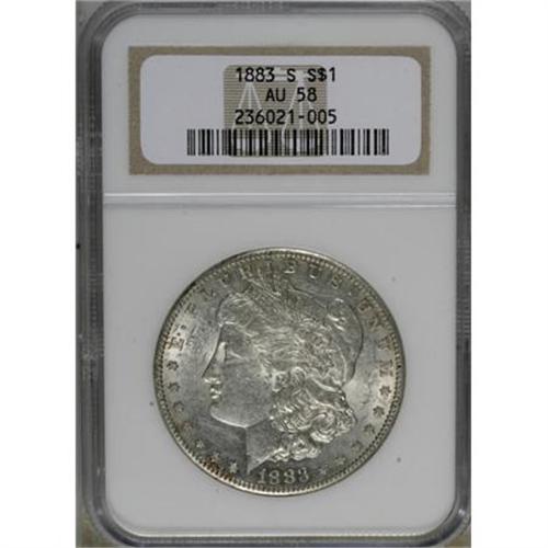 <B>1883-S $1 AU58 NGC.</B></I> NGC Census: (445/1415). PCGS Population (307/2257). Mintage: 6,250,000. Numismedia Wsl. Price for NGC/PCGS coin in AU58: $240. (#7148)<BR><BR><B>Coin Engraver:</B> George T. Morgan<BR><BR><b>Shipping:</b> Coins & Currency (<a target="_blank" href="http://www.heritageauctions.com/common/shipping.php">view shipping information</a>)
