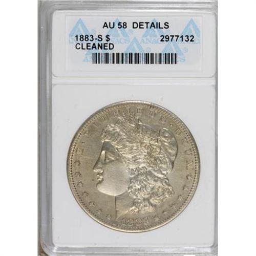 <B>1883-S $1 --Cleaned--ANACS. AU58 Details.</B></I> NGC Census: (388/1344). PCGS Population (285/2081). Mintage: 6,250,000. Numismedia Wsl. Price for NGC/PCGS coin in AU58: $233. (#7148)<BR><BR><b>Shipping:</b> Coins & Currency (<a target="_blank" href="http://www.heritageauctions.com/common/shipping.php">view shipping information</a>)