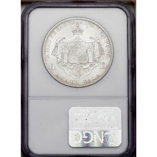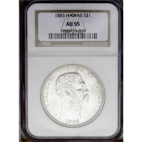 <B>1883<img border='0' src='http://www.heritagecoins.com/images/star.gif' width=10 height=10>$1> Hawaii Dollar AU55 NGC.</B></I> A pleasing light gray example with sharp design details. Nearly full luster is visible on both sides of this example. Light hairlines and other minor imperfections are barely visible. Listed on page 376 of the just released 2007 <I>Guide Book.</B></I> The 60th edition of this popular reference again has prices properly aligned in their respective grade columns, correcting an error that occurred in the 59th edition.