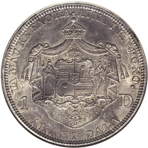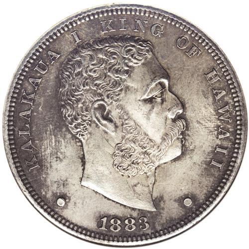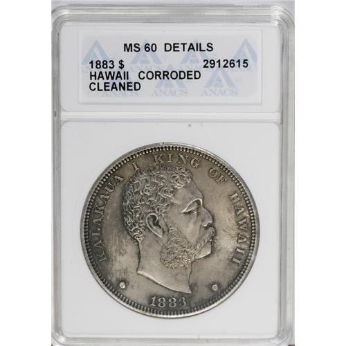 <B>1883 S$1 Hawaii Dollar--Corroded, Cleaned--ANACS. MS60 Details.</B></I> Well struck with considerable luster and variegated, grayish rose-brown patina. Few surface blemishes are seen on either side, and the only noticeable one resides on King Kalakaua's neck, below the beard. Slight corrosion is noted near the reverse center, and the piece is somewhat bright from an old cleaning.<BR><BR><b>Shipping:</b> Coin/Currency (<a target="_blank" href="http://www.heritageauctions.com/common/shipping.php">view shipping information</a>)