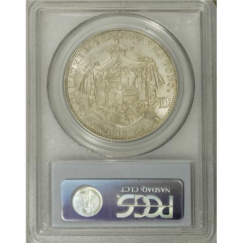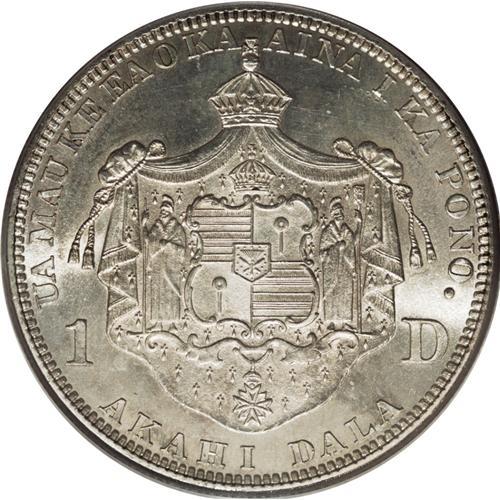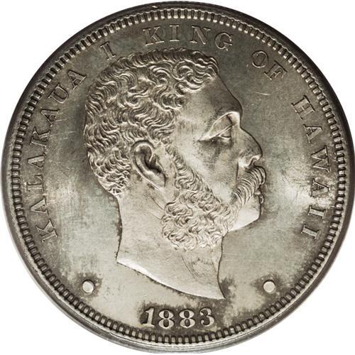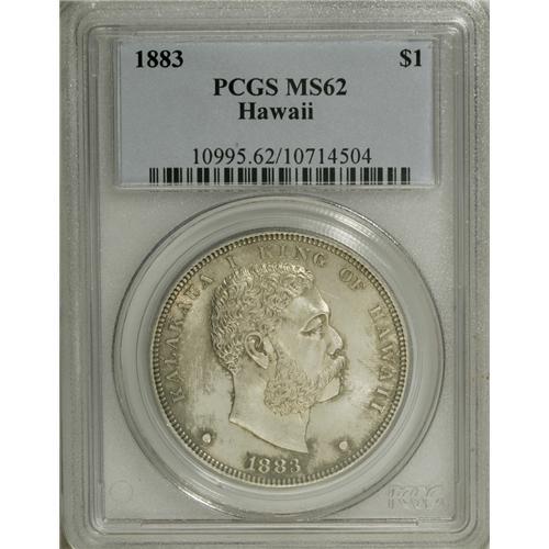 <B>1883 S$1 Hawaii Dollar MS62 PCGS.</B></I> The sizable Hawaii dollars sustained the greatest rate of attrition following the 1900 recall of the Kalakaua coinage. The examples that survive today, and Mint State pieces in particular, are highly prized. This solidly struck representative is one such coin. It has highly lustrous surfaces with splashes of gold and brown near the rims. A number of abrasions in the obverse fields account for the grade. Population: 21 in 62, 36 finer (1/07).<BR><BR><b>Shipping:</b> Coins & Currency (<a target="_blank" href="http://www.heritageauctions.com/common/shipping.php">view shipping information</a>)