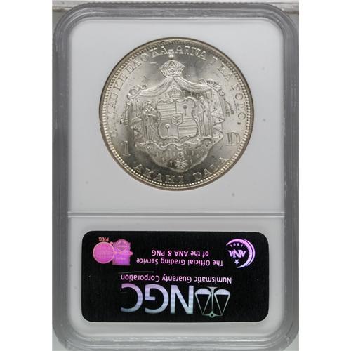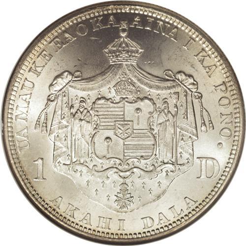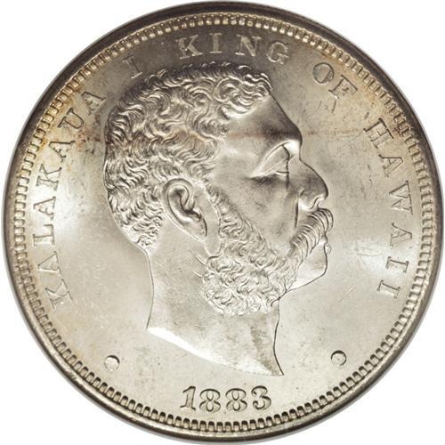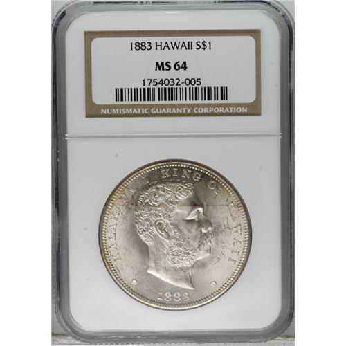 <B>1883 S$1 Hawaii Dollar MS64 NGC.</B></I> When Hawaii became a U.S. Territory in 1900, the Treasury decreed that the Islands use United States coins of the normal denominations and designs. In this regard, Walter Breen, in his <I>Complete Encyclopedia of U.S. and Colonial Coins:</B></I> "Accordingly, orders went out to banks and other establishments in the Islands, ordering withdrawal of all the 1883 Hawaiian coins (struck by the U.S. for Hawaii in that year) from circulation; as soon as any were deposited, they were to be shipped back to the mainland for melting. This made the Dala (an example of which appears in this lot) a scarce coin, especially in choice condition ... ." Breen further indicates that of the original 500,000 dalas, or dollars, minted, 453,622 pieces were melted. NGC and PCGS have certified a few hundred of these coins in all grades, about 120 of which are Mint State (3/07).<BR> The near-Gem specimen offered here displays dazzling luster, and just the barest hint of golden-tan color at the margins, as well as a faint reddish-tan streak across the upper obverse. A well executed strike brings out sharp definition on the design features, including the intricacies in the king's hair and beard and those in the reverse central device. A few light marks and luster grazes preclude a higher grade. Census: 15 in 64, 18 finer (3/07).<BR><BR><b>Shipping:</b> Coins & Currency (<a target="_blank" href="http://www.heritageauctions.com/common/shipping.php">view shipping information</a>)