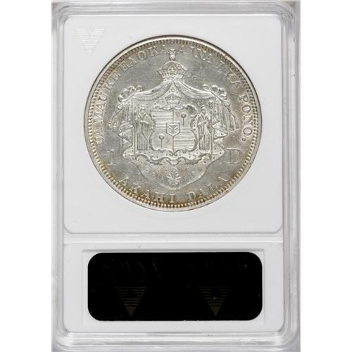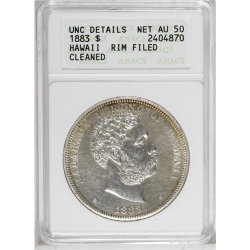 <B>1883<img border='0' src='http://www.heritagecoins.com/images/star.gif' width=10 height=10>$1> Hawaii Dollar--Rim Filed, Cleaned--ANACS. Unc. Details, Net AU50.</B></I> Light golden-brown peripheral toning aids the eye appeal of this otherwise untoned example. Gently cleaned, but evidence of rim filing is minimal, even adjacent to minor rim dings at 9:30 on the obverse and 4 o'clock on the reverse.