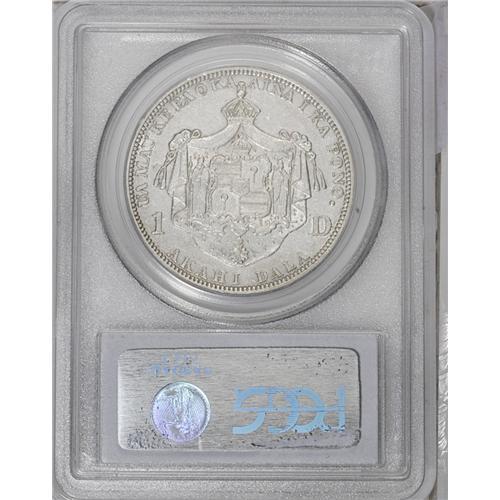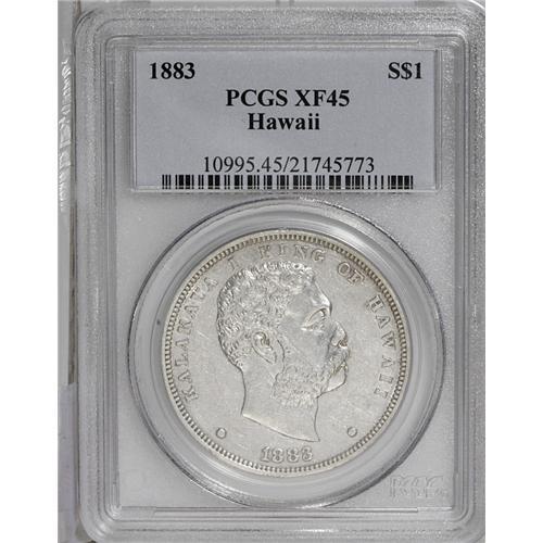 <B>1883<img border='0' src='http://www.heritagecoins.com/images/star.gif' width=10 height=10>$1> Hawaii Dollar XF45 PCGS.</B></I> Traces of reflective luster appear at the periphery. Light, even wear has left most of the design visible. Listed on page 376 of the 2007 <I>Red Book.</B></I>