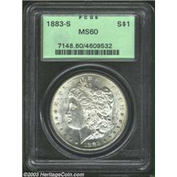<TR><TD width="100%"><TABLE cellSpacing=1 cellPadding=3 width="100%" border=0><TBODY><TR><TD width="100%" bgColor=#79735c><FONT face=arial color=#ffffff size=3><B>Description</B> </FONT></TD></TR><TR><TD width="100%" bgColor=#ffffff><FONT face=arial size=2><B>1883-S $1 MS60 PCGS.</B></I> Well struck and essentially brilliant, with full mint luster and semi-prooflike fields, this example is extensively and rather harshly abraded, especially on the obverse. </FONT></TD></TR></TBODY></TABLE></TD></TR></TBODY></TABLE><BR><A name=PricesRealized></A><TABLE cellSpacing=0 cellPadding=0 width="100%" bgColor=#000000 border=0><TBODY><TR><TD width="100%"><TABLE cellSpacing=1 cellPadding=3 width="100%" border=0><TBODY><TR><TD width="100%" bgColor=#79735c><A name=PR><FONT face=arial color=#ffffff size=3><B>Previous Prices from Heritage Auctions</B> </FONT></A></TD></TR><TR><TD bgColor=#f6f6ed><TABLE cellSpacing=0 cellPadding=0 width="100%" border=1><TBODY><TR><TD align=middle width="33%"><B>Date</B></TD><TD align=middle width="33%"><B>Service</B></TD><TD align=middle width="33%"><B>Price</B></TD></TR><TR bgColor=whitesmoke><TD width="33%"><B>09/28/2002</B></TD><TD width="33%">PCGS</TD><TD width="33%">$402.50</TD></TR><TR bgColor=whitesmoke><TD width="33%"><B>08/08/1998</B></TD><TD width="33%">PCGS</TD><TD width="33%">$286.00</TD></TR><TR bgColor=whitesmoke><TD width="33%"><B>07/30/2002</B></TD><TD width="33%">NGC</TD><TD width="33%">$425.50</TD></TR><TR bgColor=whitesmoke><TD width="33%"><B>11/18/2000</B></TD><TD width="33%">ANACS</TD><TD width="33%">$281.75</TD></TR><TR bgColor=whitesmoke><TD width="33%"><B>12/09/1994</B></TD><TD width="33%">ANACS</TD><TD width="33%">$231.00</TD></TR></TBODY></TABLE></TD></TR><TR><TD bgColor=#ffffff><FONT face=arial size=1 ?>PLEASE NOTE: All prices realized reflect the final hammer price PLUS the buyer's premium in auctions that charge a buyer's premium. Each item has a notation at the top of the listing indicating whether that lot included a buyer's premium. Example: A item that sells with a final hammer price of $100 and a 20% buyer's premium will display with a price realized of $120. All information listed is intended to be as accurate as possible, but errors are possible. Please use this guide carefully and inform us of any inaccuracies. </FONT></TD></TR></TBODY></TABLE></TD></TR></TBODY></TABLE><BR><TABLE cellSpacing=0 cellPadding=0 width="100%" bgColor=#000000 border=0><TBODY><TR><TD width="100%"><TABLE cellSpacing=1 cellPadding=3 width="100%" border=0><TBODY><TR><TD width="100%" bgColor=#79735c colSpan=6><FONT face=arial color=#ffffff size=3><B>Price Guide*</B> </FONT></TD></TR><TR bgColor=#f6f6ed><TD align=middle><B>Grade</B> </TD><TD align=middle><B>Coin World<BR>(Trends)</B> </TD><TD align=middle><B>Numismedia<BR>Retail</B> </TD><TD align=middle><B>Numismedia<BR>Wholesale</B> </TD><TD align=middle><B>Coin<BR>Universe</B> </TD><TD align=middle><B>Heritage<BR>Value Index</B> </TD></TR><TR bgColor=#ffffff><TD align=middle>58</TD><TD align=right>$425.00</TD><TD align=right>$276.00</TD><TD align=right>$230.00</TD><TD align=right>---</TD><TD align=right>$238.37</TD></TR><TR style="FONT-WEIGHT: bold" bgColor=#cccfdd><TD align=middle>60</TD><TD align=right>$500.00</TD><TD align=right>$420.00</TD><TD align=right>$350.00</TD><TD align=right>$450.00</TD><TD align=right>$352.25</TD></TR><TR bgColor=#ffffff><TD align=middle>61</TD><TD align=right>---</TD><TD align=right>$480.00</TD><TD align=right>$400.00</TD><TD align=right>$600.00</TD><TD align=right>$466.25</TD></TR><TR bgColor=#ffffff><TD colSpan=6><FONT size=1>*All information listed is intended to be as accurate as possible, but errors are possible. No item may be returned or refused based on this information which is provided as a service to our customers. You should contact each pricing source directly to determine the accuracy of this information. </FONT></TD></TR></TBODY></TABLE></TD></TR></TBODY></TABLE><BR><TABLE cellSpacing=0 cellPadding=0 width="100%" bgColor=#000000 border=0><TBODY><TR><TD width="100%"><TABLE cellSpacing=1 cellPadding=3 width="100%" border=0><TBODY><TR><TD width="100%" bgColor=#79735c><FONT face=arial color=#ffffff size=3><B>Population Guide</B> </FONT></TD></TR><TR bgColor=#ffffff><TD align=middle><!-- Begin Output of Population Grid--><TABLE cellSpacing=0 cellPadding=0 width="100%" border=0><TBODY><TR><TD vAlign=center><TABLE cellSpacing=0 width="100%" border=1 cellsadding="3"><TBODY><TR><TD vAlign=center><TABLE cellSpacing=0 cellPadding=3 width="100%" border=1><TBODY><TR><TD vAlign=center align=middle bgColor=#f0f1e8 colSpan=2 <CENTER><FONT face=Arial size=2><B>PCGS Pop </B></FONT><CENTER></CENTER></TD><TD vAlign=center align=middle bgColor=#f0f1e8 colSpan=2><CENTER><FONT face=Arial size=2><B>NGC Pop</B></CENTER></FONT></TD></TR><TR><TD vAlign=center><FONT face=Arial size=2>(60)</FONT> </TD><TD vAlign=center align=right><FONT face=Arial size=2>135</FONT> </TD><TD vAlign=center><FONT face=Arial size=2>(60)</FONT> </TD><TD vAlign=center align=right><FONT face=Arial size=2>57</FONT> </TD></TR><TR><TD vAlign=center><FONT face=Arial size=2>(>60)</FONT> </TD><TD vAlign=center align=right><FONT face=Arial size=2>1527</FONT> </TD><TD vAlign=center><FONT face=Arial size=2>(>60)</FONT> </TD><TD vAlign=center align=right><FONT face=Arial size=2>985</FONT> </TD></TR></TBODY></TABLE></TD></TR></TBODY></TABLE></TD></TR></TBODY></TABLE><!-- End Output of Population Grid--></TD></TR></TBODY></TABLE></TD></TR></TBODY></TABLE><BR><TABLE cellSpacing=0 cellPadding=0 width="100%" bgColor=#000000 border=0><TBODY><TR> Important notice: We expect to be auctioning lots at the rate of 200-250 per hour. On occasion eBay live bid software cannot keep up with the pace of the auctions where 4-5 lots per minute can hammer down, so we recommend that you place a realistic absentee bid now as insurance to avoid disappointment. Also please note that all Heritage/CAA lots purchased through eBay Live carry a 20% Buyer's 